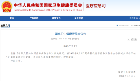 国家卫生健康委员会公告 发布时间: 2026-03-25 来源: 医疗应急司 2026年第3号 根据《中华人民共和国传染病防治法》相关规定,