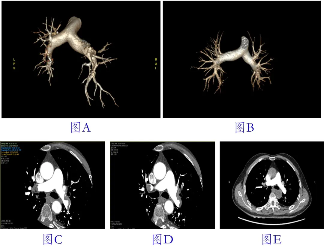 73岁的王先生(化名)平日坚持日行万步,身体硬朗,近日却突发活动后气促、呼吸困难,被诊断为“中危大面积肺栓塞”,经评估患者三十天内死亡风险超11%。给予两周规范抗凝与循序渐进的康复,最终顺利出院。抗凝治疗前后肺血管CTA对比显示治疗效果显著(图A、C、D为治疗前,B、E为治疗后)。