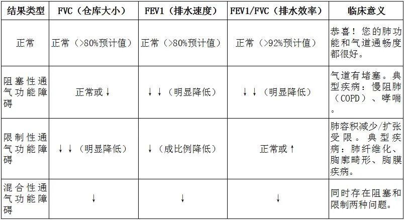 ·限制性问题:就像本身的储水箱变小了(FVC降低),虽然排水管道是通的,但总水量和排水量都少了。