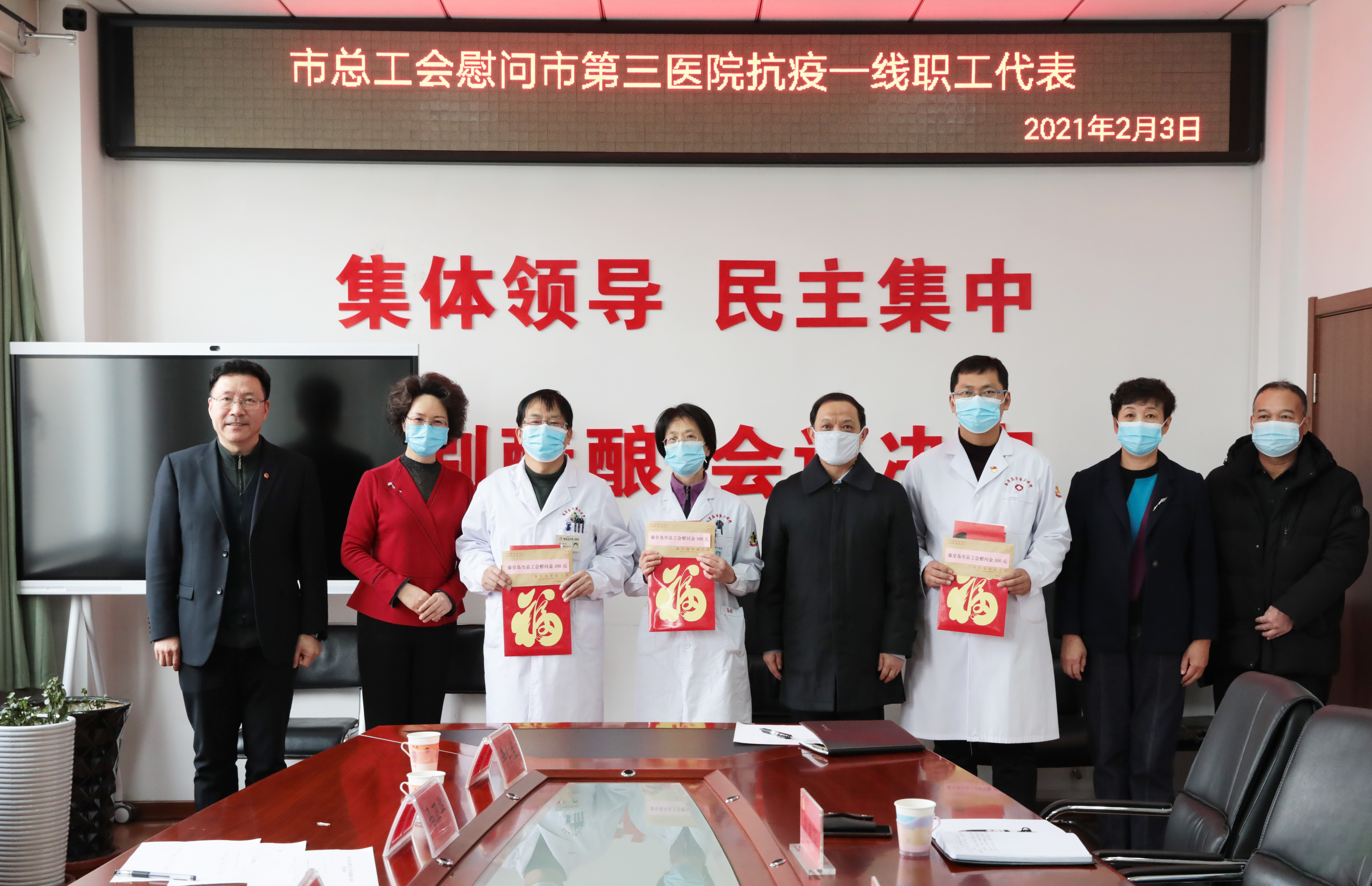 2月3日上午,市总工会党组成员、教科文卫工会主席张文利、四级调研员张冬梅、教科文卫工会副主席马卫华来到市第三医院慰问疫情防控一线职工代表,市卫健委系统工会主席李仁生参加慰问。市第三医院院长陈满、党委书记赵雅君、纪委书记廉璐琛陪同。