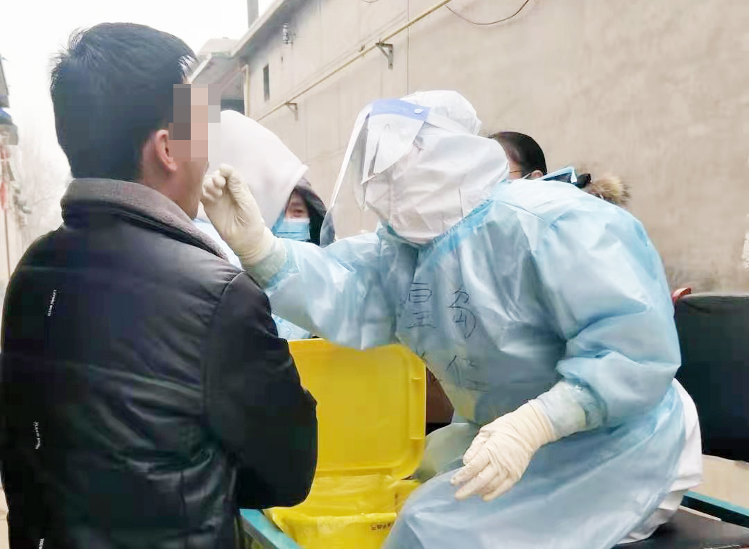 采集需要把棉签探入咽部很深的位置,人体会自然产生恶心甚至呕吐反应,这个环节很考验实际操作和沟通能力。采集对象中也有1岁多的孩子,拭子一探进咽部就恶心、哭闹,孩子太小不能配合,志愿者在一边不停的哄着孩子,分散注意力,我也耐心的等待着、安慰着孩子,找准机会快速探入采集,动作一气呵成。一位40多岁的男子对采集位置过深很不理解,他用力把我的手推开,没好气的对我说:“就在舌头上擦几下得了,为啥一劲儿捅嗓子眼儿啊?”当时他挺不满的,态度不愿配合。我向他讲解了采集原理和操作细节,希望能够多多配合。其实我心里也生气,更多的还是委屈。两位志愿者妹妹非常暖心的安慰我,又跟村干部一起教育了那位村民应该配合医务人员的采集工作。这之后入户采集的时候,我主动拉近与村民的距离,学着方言与他们对话,指导配合动作的时候效果还不错。