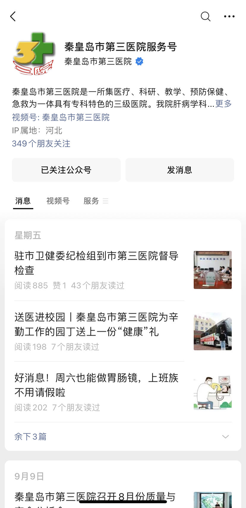 微信搜索“秦皇岛市第三医院服务号”关注并进入。