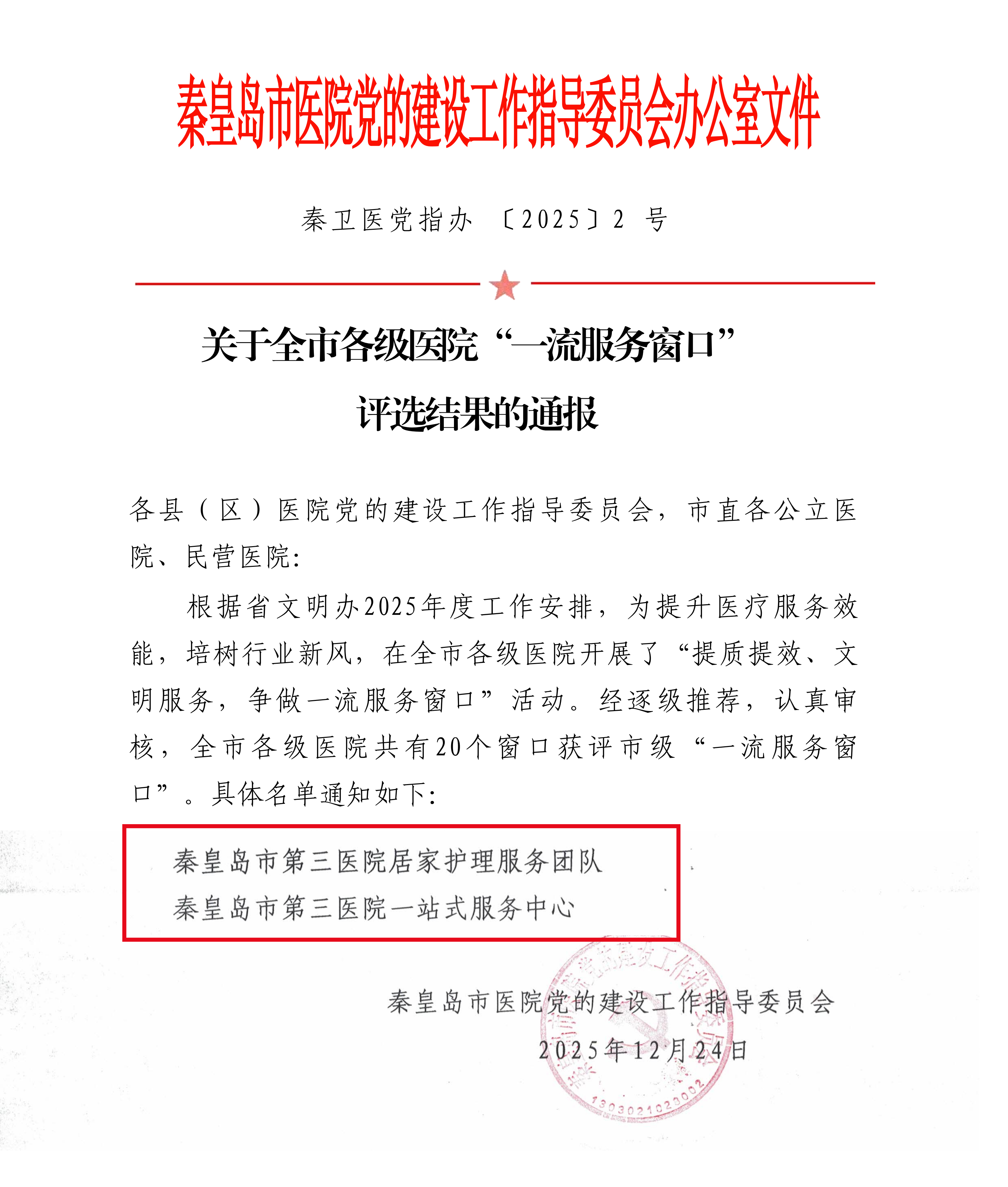 近日,全市公立医院“提质提效文明服务 创建一流服务窗口” 竞赛评选结果正式公布。我院居家护理服务团队、一站式服务中心凭借扎实的服务能力、优异的群众口碑,成功获评市级 “一流服务窗口” 荣誉称号。